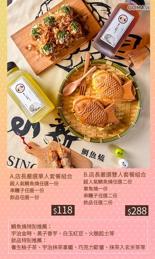 餡料豐富的鯛魚燒與香甜軟糯的串糰子,再配上精心推薦的清爽飲品,平衡口中滋味,絕對是完美搭配喔!
