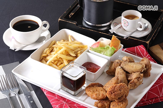 美式炸物拼盤一份(內含:香酥炸雞翅+香酥雞塊+美式薯條+茶凍+優格水果) + 飲品:美式熱咖啡/冰滴咖啡/桂圓紅棗茶/蔓越莓果醋/水果百匯茶(冰/熱)/焦糖奶茶(冰/熱) 八選二