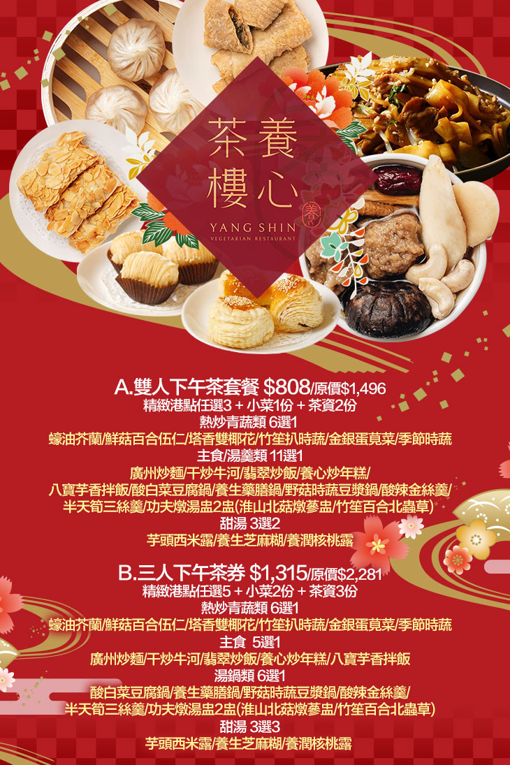 〈精緻港點任選5 + 小菜2份 + 茶資3份 + 熱炒青蔬類:蠔油芥蘭/鮮菇百合伍仁/塔香雙椰花/竹笙扒時蔬/金銀蛋莧菜/季節時蔬 6選1 + 主食:廣州炒麵/干炒牛河/翡翠炒飯/養心炒年糕/八寶芋香拌飯 5選1 + 湯鍋類:酸白菜豆腐鍋/養生藥膳鍋/野菇時蔬豆漿鍋/酸辣金絲羹/半天筍三絲羹/功夫燉湯盅2盅(淮山北菇燉蔘盅/竹笙百合北蟲草) 6選1 + 甜湯:芋頭西米露/養生芝麻糊/養潤核桃露 3選3〉