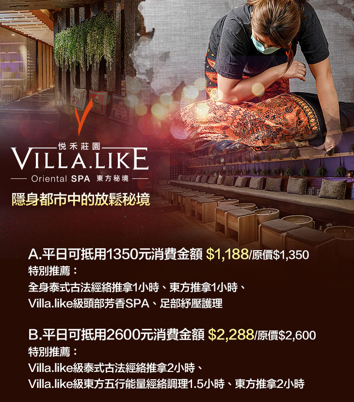 全身泰式古法經絡推拿1小時、東方推拿1小時、Villa.like級頭部芳香SPA、足部紓壓護理、Villa.like級泰式古法經絡推拿2小時、Villa.like級東方五行能量經絡調理1.5小時、東方推拿2小時。