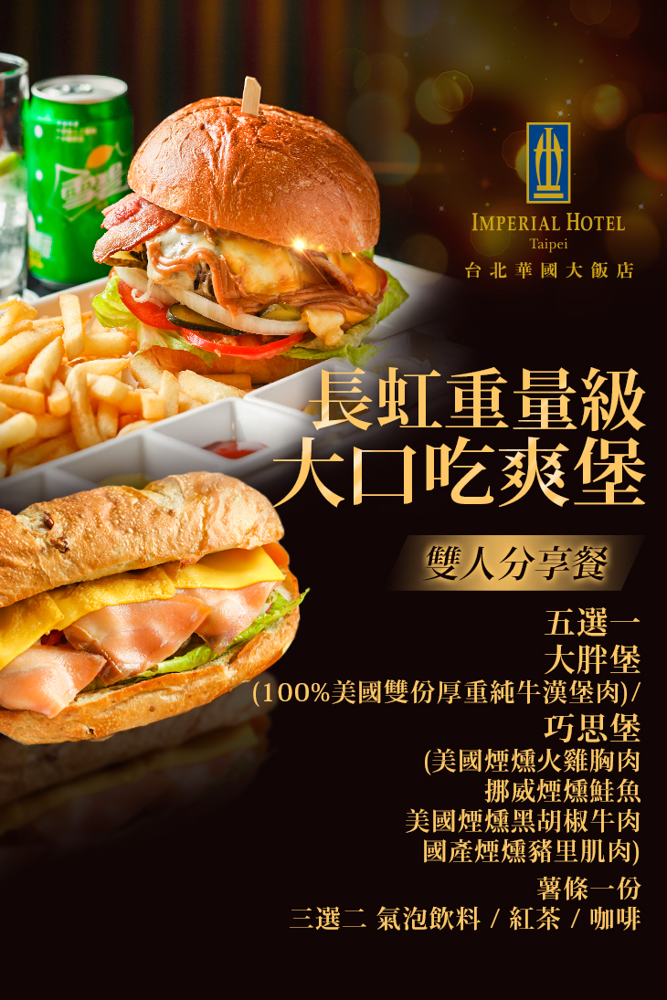 大胖堡(100%美國雙份厚重純牛漢堡肉)/巧思堡(美國煙燻火雞胸肉/挪威煙燻鮭魚/美國煙燻黑胡椒牛肉/國產煙燻豬里肌肉) 五選一 + 薯條一份 + 氣泡飲料/紅茶/咖啡 三選二
