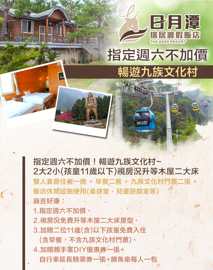 ★ 視房況免費升等木屋二大床房型,加贈二位11歲(含)以下孩童免費入住。專案含九族文化村門票二張,玩遍雲霄飛車、金礦山、大漩渦等多種水陸遊樂設施,深度體驗原住民文化!