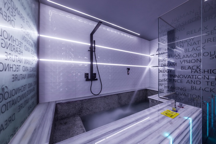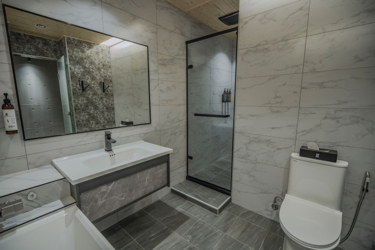 搭配質感磁磚與現代化設備,讓每一次沐浴都成為放鬆身心的享受。衛浴內配有按摩浴缸及淋浴設備,並備有吹風機,無論想泡上一池暖湯舒緩疲勞,或是快速沖洗恢復精神,都能隨心所欲。
