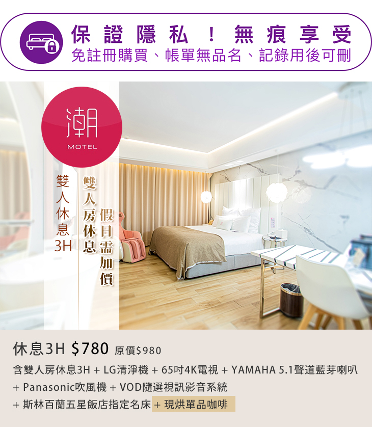 揪親朋好友一起住!提供多種房型!全台首創-館內設有電動車充電站的旅館。所有客房皆採用5星飯店御用斯林百蘭頂級名床、LG空氣清淨機,讓您享有完美的休憩時光~充滿設計感的客房,讓您休息得舒適又新潮,潮旅館就是您出外的家!