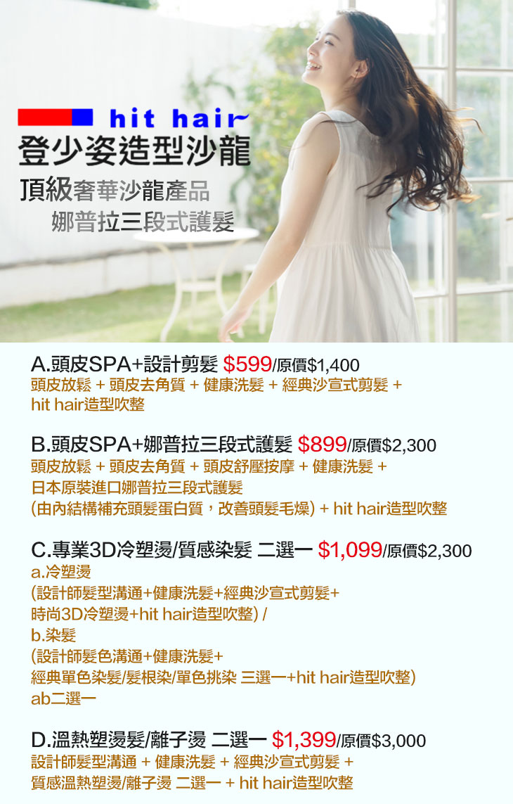A.頭皮SPA+設計剪髮 / B.頭皮SPA+娜普拉三段式護髮 / C.專業3D冷塑燙/質感染髮 二選一 / D.溫熱塑燙髮/離子燙 二選一