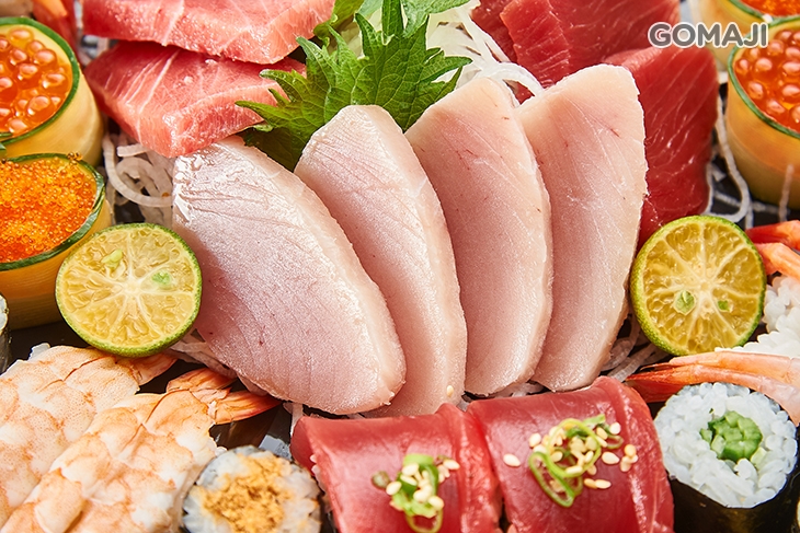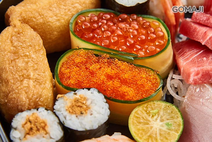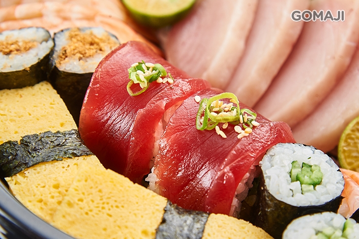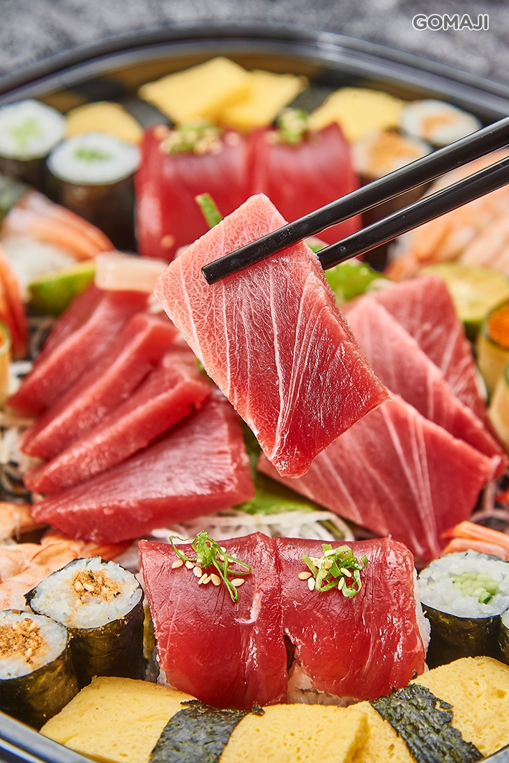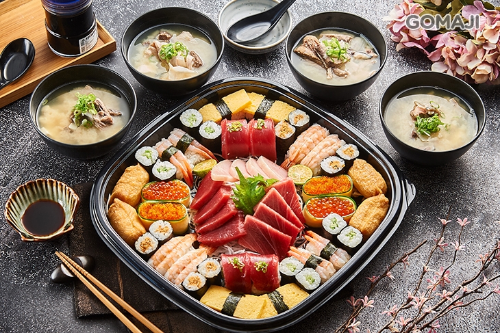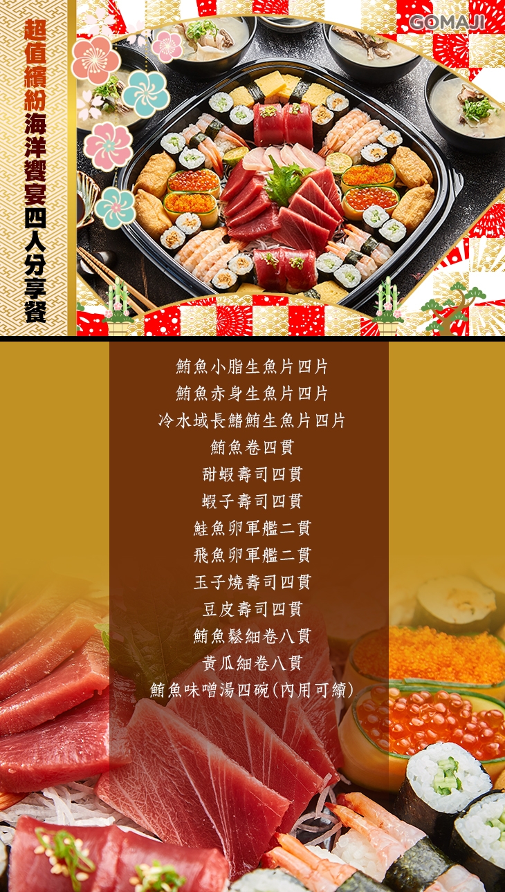 〈鮪魚小脂生魚片四片 + 鮪魚赤身生魚片四片 + 冷水域長鰭鮪生魚片四片 + 鮪魚卷四貫 + 甜蝦壽司四貫 + 蝦子壽司四貫 + 鮭魚卵軍艦二貫 + 飛魚卵軍艦二貫 + 玉子燒壽司四貫 + 豆皮壽司四貫 + 鮪魚鬆細卷八貫 + 黃瓜細卷八貫 + 鮪魚味噌湯四碗(內用可續)〉