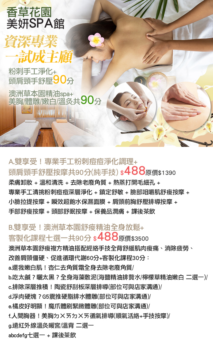 A.雙享受!專業手工粉刺痘痘淨化調理+頭肩頸手舒壓按摩共90分(純手技) / B.雙享受!澳洲草本園舒痠精油全身放鬆+客製化課程七選一共90分