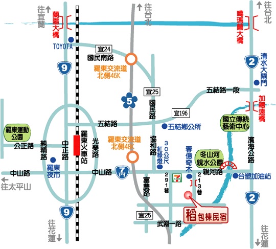 台北 → 國道五號 → 下羅東交流道 → 左轉中山路一段 (台七丙省道) → 直行接親河路二段 → 右轉213巷 →直行接武淵一路 → 稻民宿