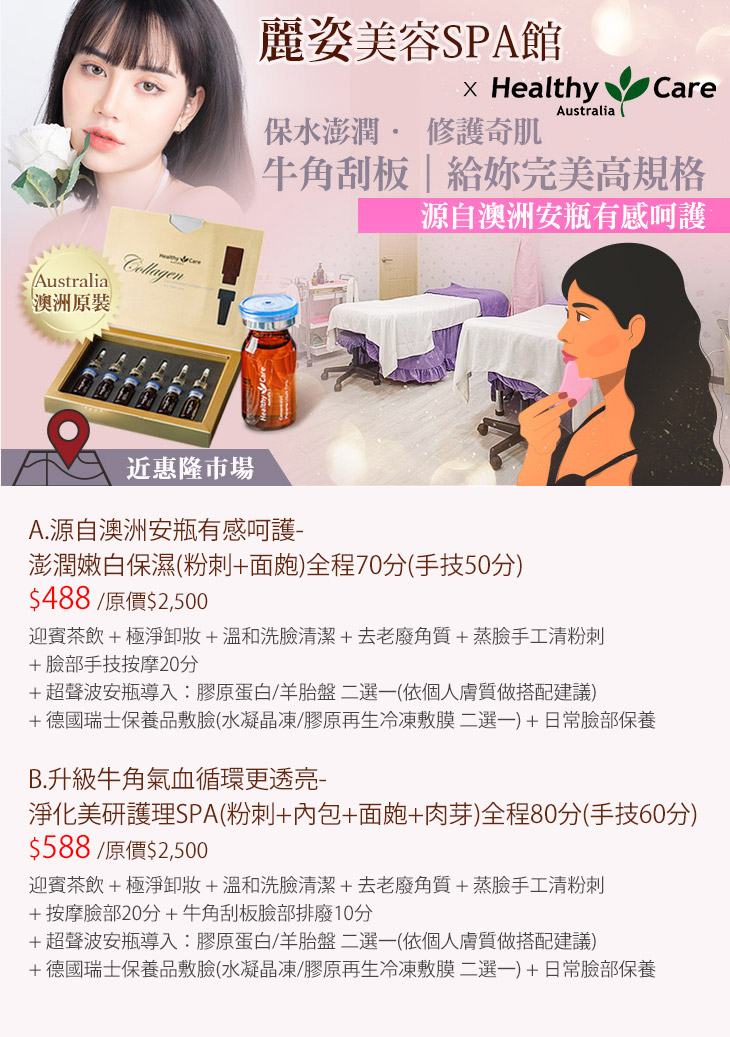 A.源自澳洲安瓶有感呵護-澎潤嫩白保濕(粉刺+面皰)全程70分(手技50分) / B.升級牛角氣血循環更透亮-淨化美研護理SPA(粉刺+內包+面皰+肉芽)全程80分(手技60分)