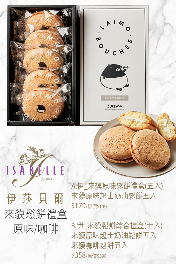 伊莎貝爾與網路人氣插畫家Cherng三度攜手合作,推出新款聯名禮盒『來貘鬆餅』,集結Cherng最喜歡的伊莎貝爾招牌鬆餅,搭配超可愛的胖來貘造型,呼應了來貘慵懶的精神!這次也以柔和的奶油白與個性淺米灰,極具質感又不失俏皮的包裝, 絕對是送禮自用的夢幻逸品之一!