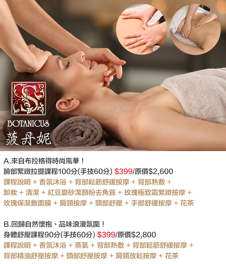 A.來自布拉格得時尚風華!臉部緊緻拉提課程100分(手技60分) / B.回歸自然懷抱、品味浪漫氛圍!身體舒壓課程90分(手技60分)