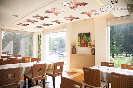 建築四周為除了利用花草樹木,營造綠色原野中的人間樂土,室內空間的天花板上,更烙印美麗花朵,搭配地中海風情的桌椅,品嚐精心製作的法式餐點,陽光從一旁的落地窗斜灑進來,讓麻吉盡情享受眼前的所擁有的美好事物!