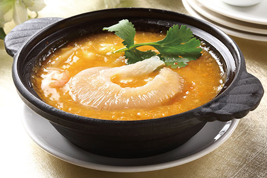 黃金蟹肉魚翅羹是用高成本的上湯再加上本土的南瓜熬製而成,讓這道湯品有了金黃色的色澤,更加奢華再加上新鮮的蟹肉、高貴的魚翅,品嘗著黃金蟹肉魚翅羹更顯得美味時尚。
