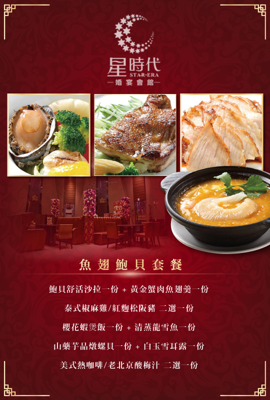 由台中星時代婚宴會館全新推出的豪華極品饗宴-魚翅鮑貝套餐,品嚐頂級鮑貝、魚翅,搭配海陸齊享的華麗美饌,品味精緻菜餚!嚴選新鮮食材真材實料烹調技術,美味程度連饕客都讚不絕口,在奢華浪漫空間內,享用頂級逸品,為自己來場美食饗宴,享受尊貴禮遇的美好食光!