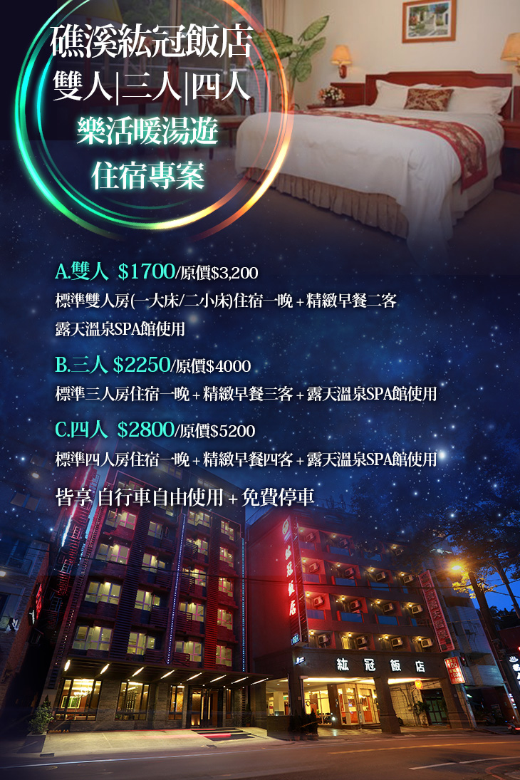 來到礁溪紘冠飯店,泡著露天碳酸氫鈉離子溫泉,晝看青山美景,夜觀滿天星斗,沏壺上等好茶享受人生不也如此嗎?備妥一切,靜待您的到來!貼切服務、溫馨如家!