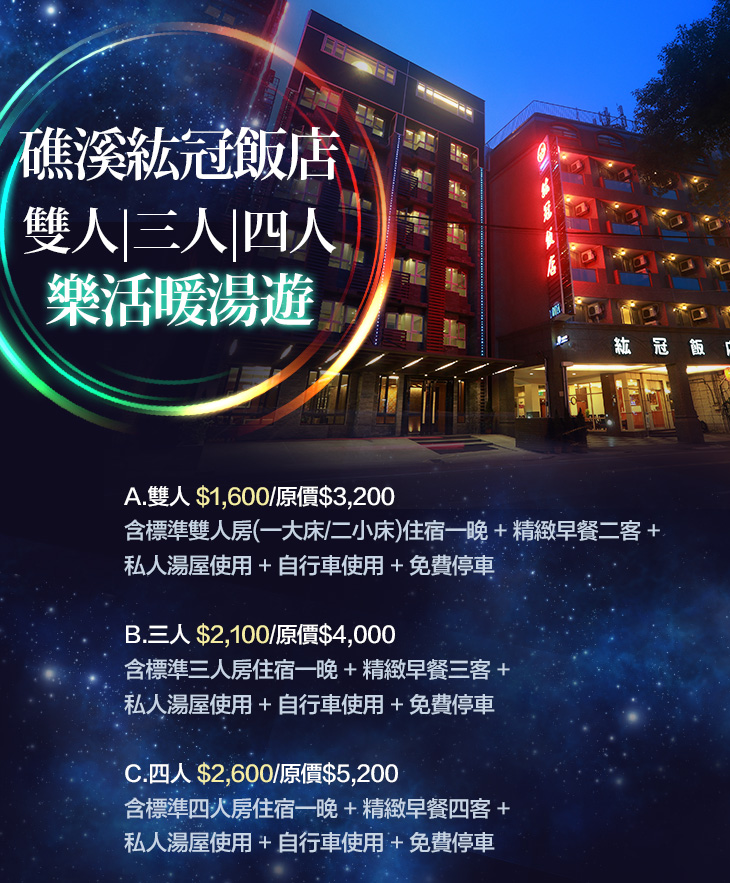 來到礁溪紘冠飯店,泡著露天碳酸氫鈉離子溫泉,晝看青山美景,夜觀滿天星斗,沏壺上等好茶享受人生不也如此嗎?備妥一切,靜待您的到來!貼切服務、溫馨如家!