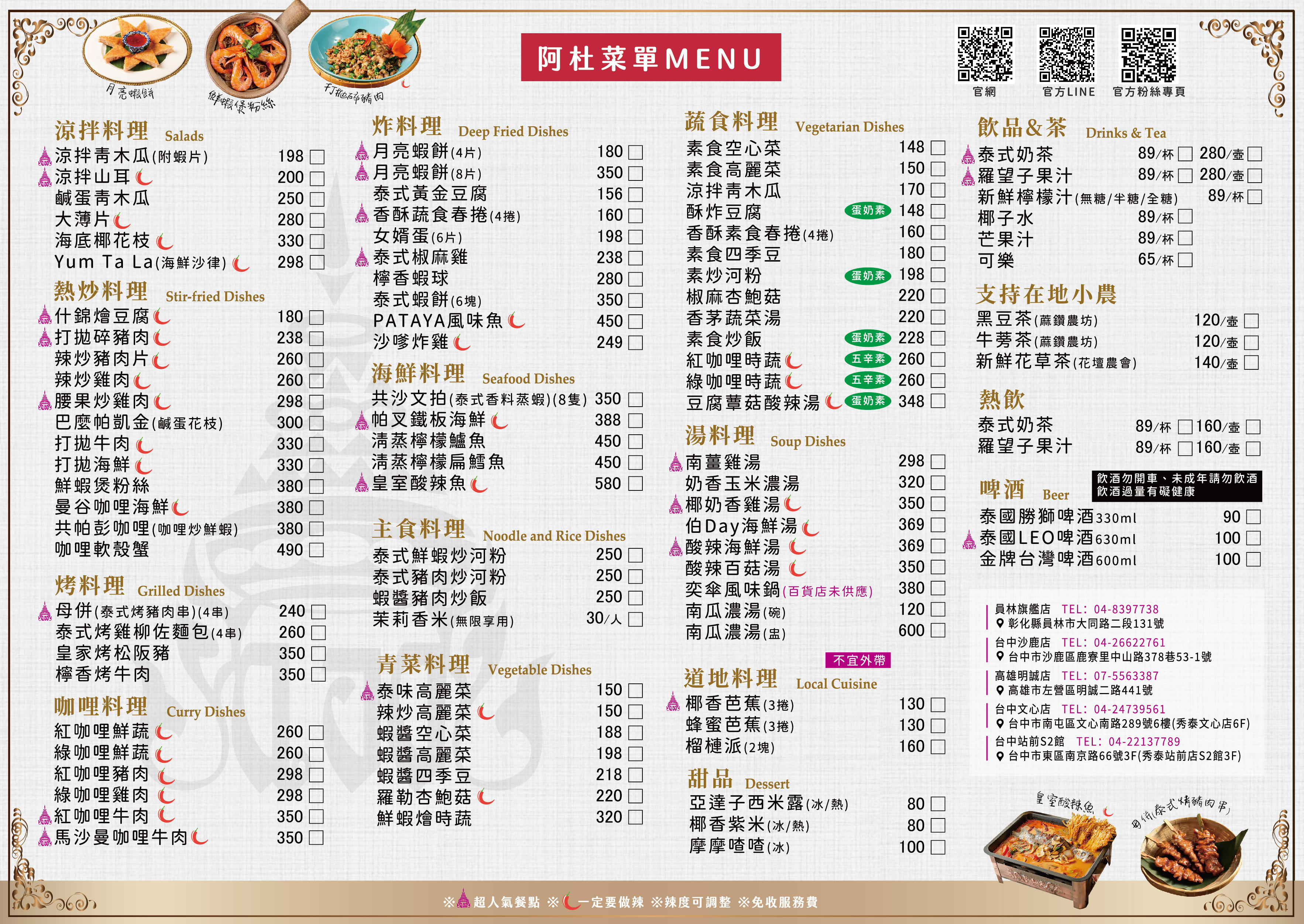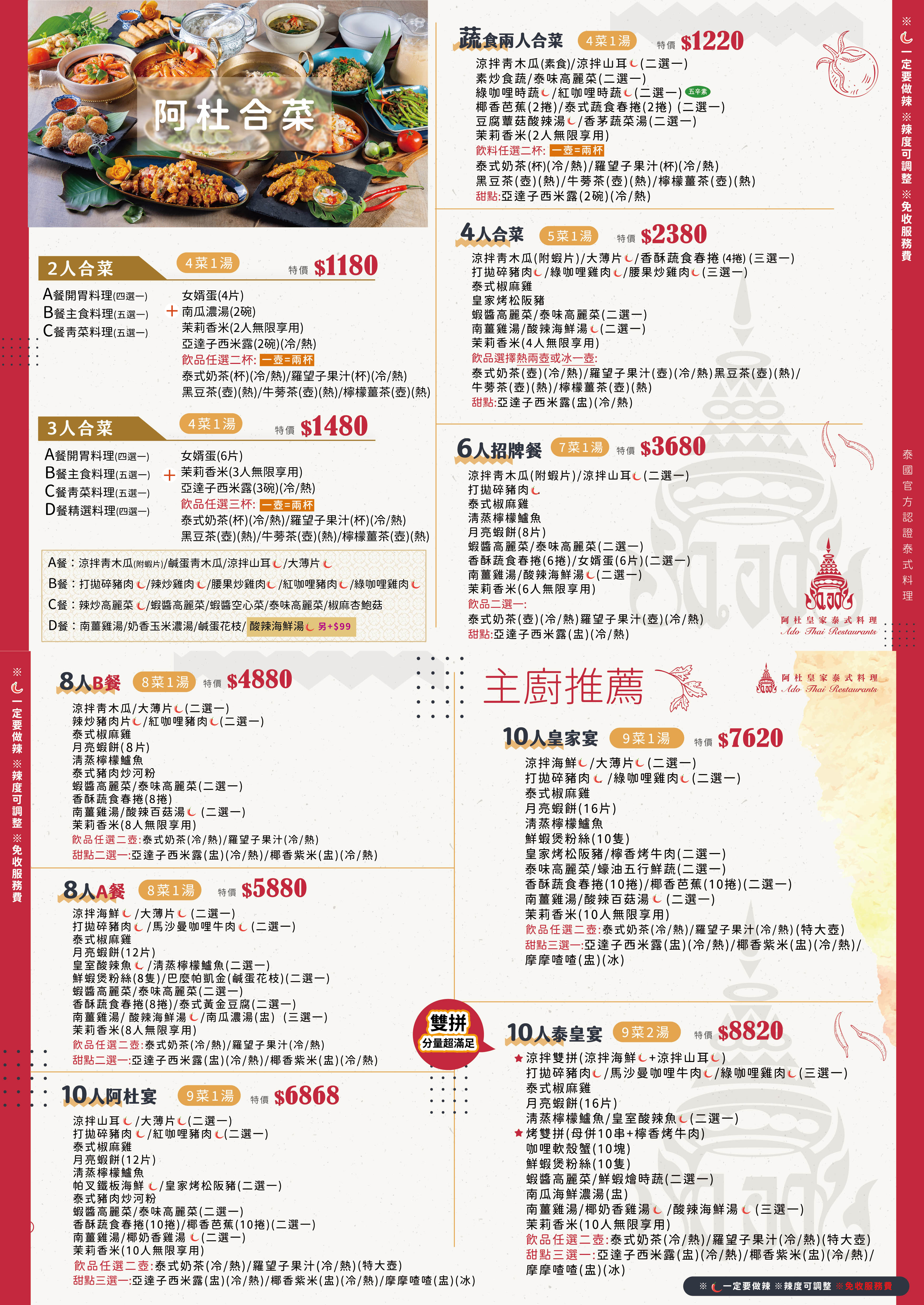 泰北青年離鄉背井來到台灣打拼,將對家鄉的思念,化作獨特具異國風情之佳餚,與顧客分享美食喜悅中,一解思鄉之情。泰式經典合菜,享受道地的經典美食!泰國行政主廚阿杜師傅親自料理!台中、員林、高雄,多分店皆可使用,讓每一位朋友都能享受到正宗的泰式風情!