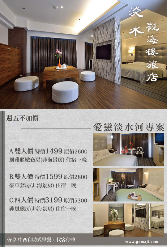 觀海樓旅店以經營最有人情味的旅店為理念,用細心堆砌景致,用專業營造品質,希望每位來此渡假的旅客,從踏入觀海樓旅店的那一剎那,就可以感受到觀海樓旅店的用心。還可以順遊淡水老街,近年來更因不少古董店及民藝品店進駐,也營造出民俗色彩與懷舊風味,提供舒適的台北淡水旅遊體驗。