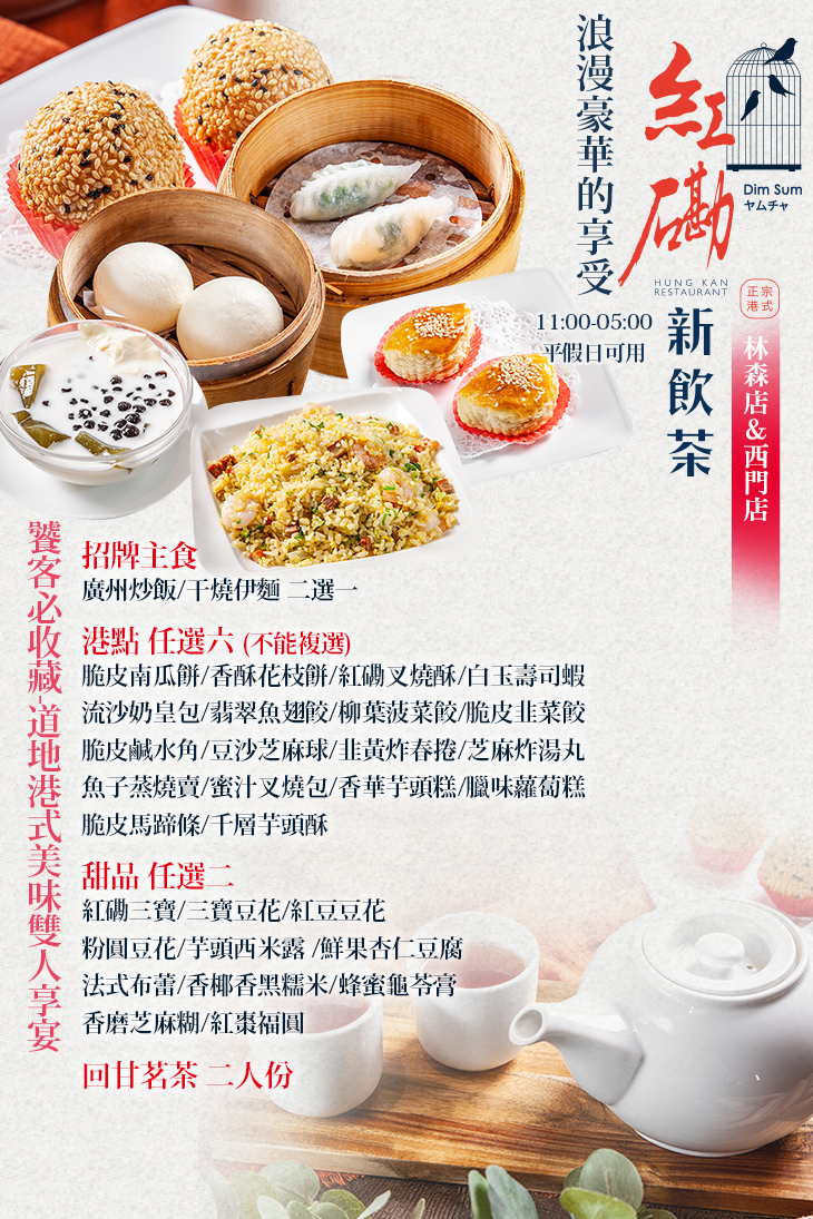 提供上百種港式名菜與茶點,像是脆皮雞、芋頭香酥鴨,還有腸粉、叉燒包等,都是現點現作,不使用半成品。除了港點外,並提供燒臘、海鮮、湯品、火鍋與素食等,不論中廚菜色、喜慶宴會、各種廣東大菜皆有,絕不亞於各大飯店理之餐廳點心,有過而無不及。加上帶點現代工業風的精緻裝潢,讓客人在舒適寬敞的空間,享受道地美味的飲茶。