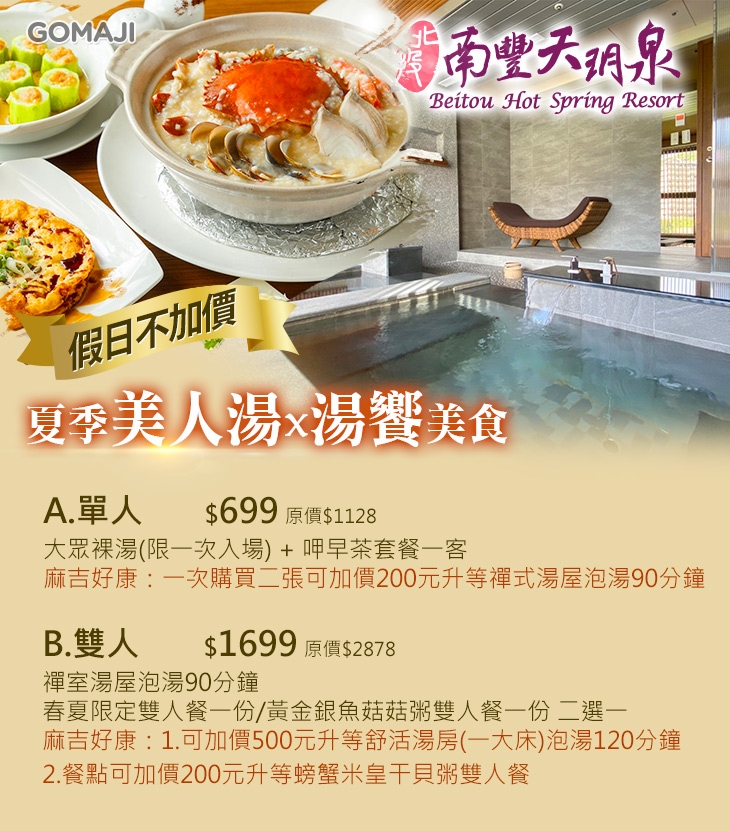 ※ B方案可加價500元升等舒活湯房泡湯120分鐘!