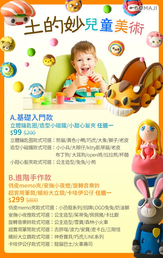 專業親切的老師帶著孩子一同手作黏土,不到一會兒就完成代表作,可帶回家珍藏,一個月內黏土損壞還能免費回店補修喔(不含音樂鈴機芯/夜燈燈泡)!鑰匙圈、小磁鐵、小髮夾、小夜燈、音樂鈴、筆筒、大立鏡、memo夾、公仔,麻吉的寶貝想製作哪一個?