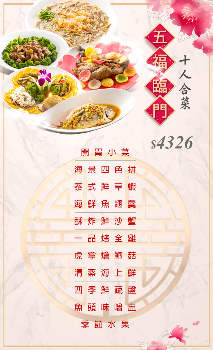 位於高雄市苓雅區海邊路45號,寬敞的店內空間不論大宴小酌都合宜!師傅以快速俐落的手藝處理食材,佐以精準火候料理,端上色香味俱全的美味饗宴,此次推出五福臨門十人合菜,道道豐盛澎湃,讓您宴客飽了肚子也有了面子!