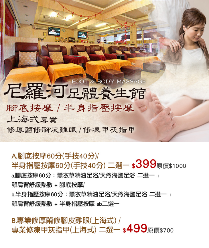 A.腳底按摩60分(手技40分)/半身指壓按摩60分(手技40分) 二選一 / B.專業修厚繭修腳皮雞眼(上海式)/專業修凍甲灰指甲(上海式) 二選一
