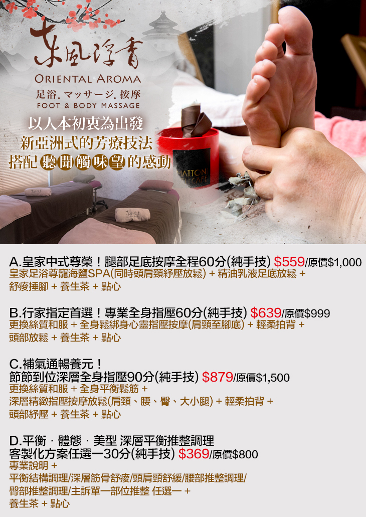 A.皇家中式尊榮!腿部足底按摩全程60分(純手技) / B.行家指定首選!專業全身指壓60分(純手技) / C.補氣通暢養元!節節到位深層全身指壓90分(純手技) / D.平衡‧體態‧美型 深層平衡推整調理 客製化方案任選一30分(純手技)