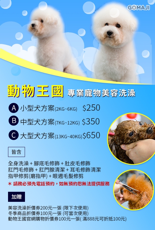 【動物王國】比不上麻吉愛護自己的寶貝,但是絕對比你更懂得照顧貓狗!專業一流的寵物美容團隊,從清潔到修整每個環節都仔細處理,將寵物視如己出般對待,乾淨舒適的工作環境,讓寶貝享受前所未有的美容待遇。現場還能添購寵物的乾糧、飼料或生活用品!