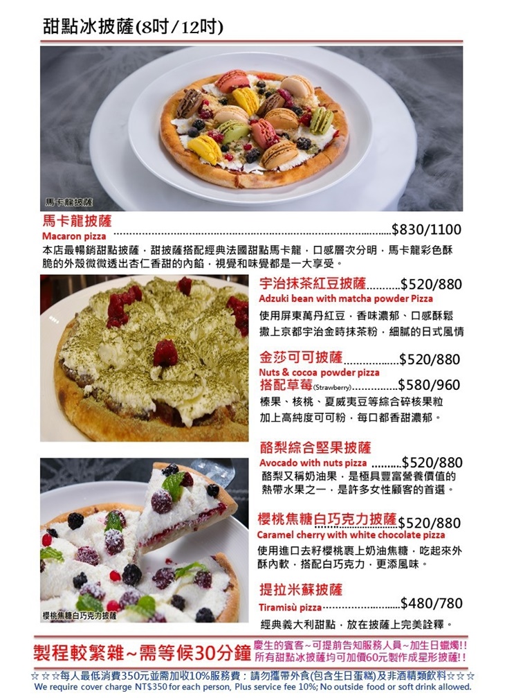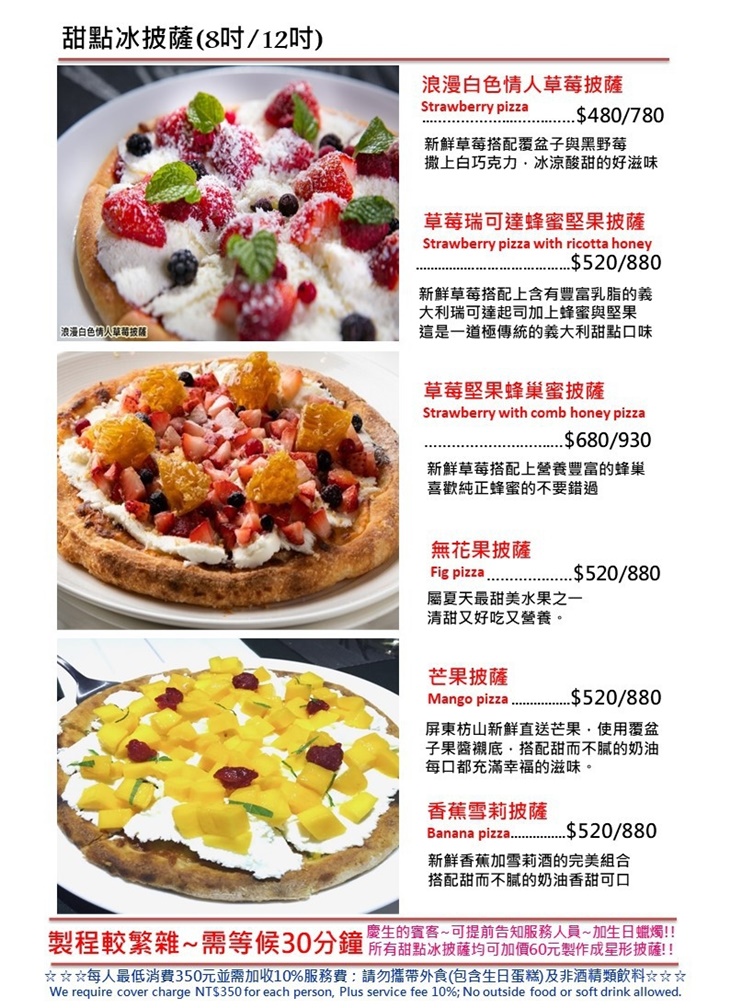 不只有一般熱呼呼的披薩,在這裡還吃得到超特別的「冰披薩」!所謂的冰披薩就是主廚在披薩出爐後,馬上放入冷凍櫃裡冰鎮,之後再加上鮮奶油、無花果、香蕉片、馬卡龍等水果甜食點綴,讓鹹食披薩搖身一變成為甜點明星,好吃又好拍,讓所有人都愛不釋口,喜歡吃手工窯烤披薩跟精緻義大利菜餚的饕客,一定要把這間餐廳收藏在口袋名單中呀!