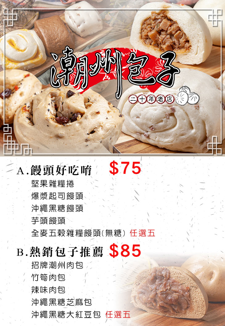 在地經營30年的老店「潮州包子」,是一間秉持「新鮮、健康、美味、創新」的包子饅頭店。從麵粉的挑選到拌攪、揉製多次發酵而成,創造出外皮Q彈、內餡飽滿、美味香甜的包子與饅頭,堅持每個細節,只為了呈現潮州包子的精髓與特色!用最好的原料、最多元的品項、最真誠的態度,要給每位顧客最幸福的好滋味!