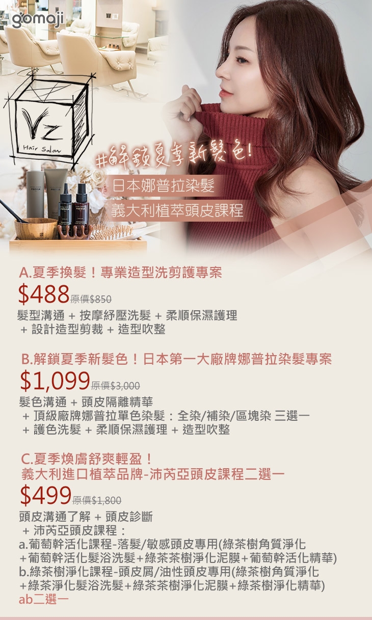 A.夏季換髮!專業造型洗剪護專案 / B.解鎖夏季新髮色!日本第一大廠牌娜普拉染髮專案 / C.夏季煥膚舒爽輕盈!義大利進口植萃品牌-沛芮亞頭皮課程二選一