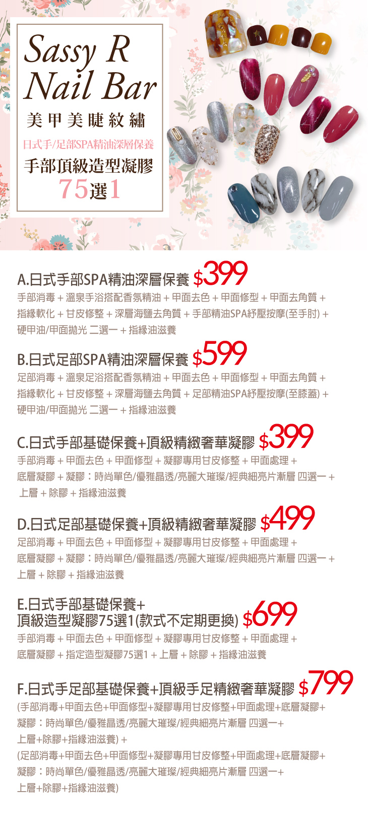 A.日式手部SPA精油深層保養 / B.日式足部SPA精油深層保養 / C.日式手部基礎保養+頂級精緻奢華凝膠 / D.日式足部基礎保養+頂級精緻奢華凝膠 / E.日式手部基礎保養+頂級造型凝膠75選1(款式不定期更換) / F.日式手足部基礎保養+頂級手足精緻奢華凝膠