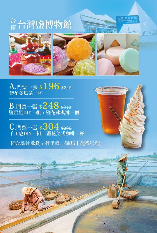 鹽不只是調味品,它更是工業之母!台灣晒鹽自明朝官員陳永華引進後,至今已有338年的歷史,【台灣鹽博物館】位於台南市七股區,在一群文化鹽工的守護下,保存台灣數百年的鹽業文化資產。現在只要196元起即可體驗台南一日遊、假日不加價多種組合優惠,麻吉這回除了能擁有入園門票一張,參觀之外還可帶走馬卡龍香氛皂伴手禮,參與手工皂DIY、鹽星星DIY等活動,最後再喝冬瓜茶、美式咖啡或吃霜淇淋喔!