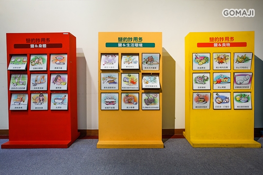 台灣鹽博館二樓的探索館,激發兒童腦中不斷發出「為什麼」的問號,讓孩子主動學習,並可增進親子間的互動。翻板式的展示牆介紹鹽在生活上的各種應用及小偏方:包含鹽與身體、鹽與清潔等等。例如利用鹽水測試蛋新不新鮮、可以磨亮銅器、可以去除咖啡的苦味等等,這些都是隨時可以運用的生活小常識喔!