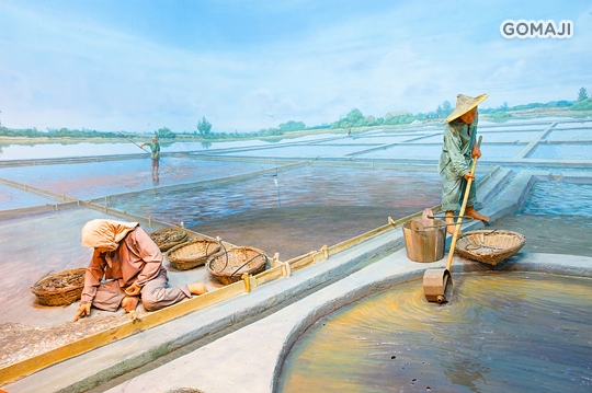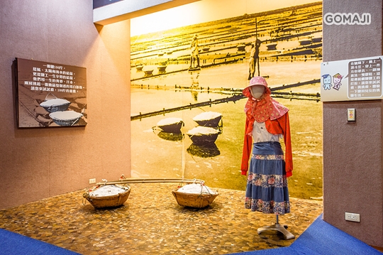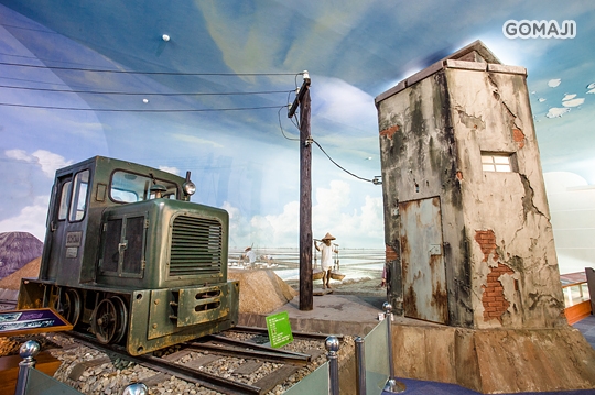 遠方的機關車載著白鹽,往鹽田裡駛來,經過鹽警崗哨旁,勾勒出民國五十年代七股土盤鹽田的工作場景。一進入鹽博館一樓大廳,映入眼簾的是鹽田的勞動景象,每一個鹽工勞動的身影,都是那麼樣的真實動人。透過實際的物件和聲光特效,中國歷史的特展室和視聽室帶麻吉走進時光隧道,體驗鹽村生活!