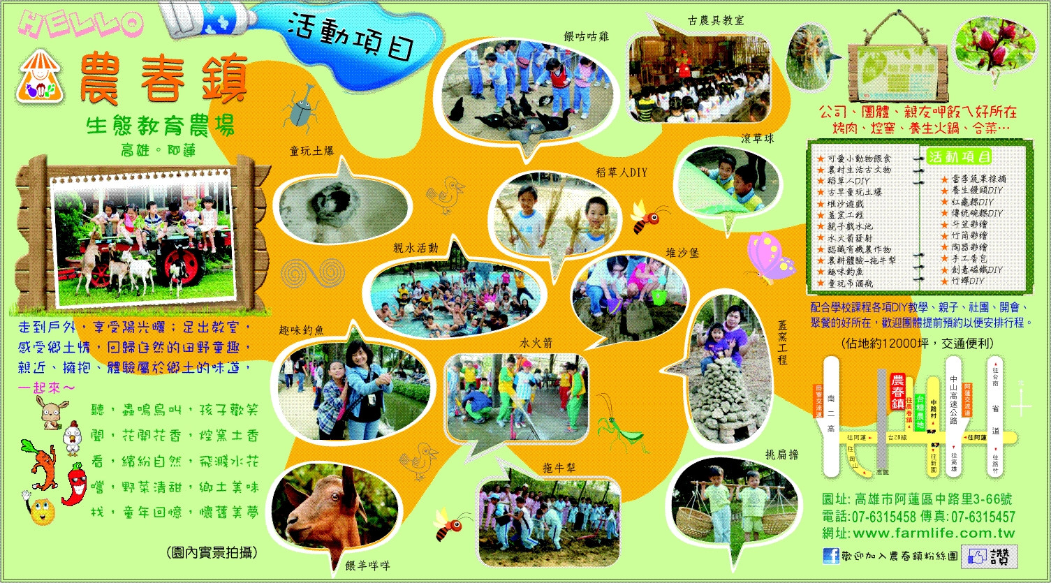 農春鎮是一個農村生活體驗結合生態為主題最具安全的戶外教學農園,並配合學校課程讓莘莘學子走出教室,體驗不一樣的學習空間而達到寓教於樂的教育目的。