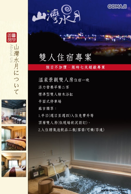 山灣水月景觀溫泉會館位於古老安通溫泉區,耗時兩年的精心打造,慢工出細活,堅持製作出最頂級的山林溫泉饗宴,同時也是通過官方認證的「特色民宿」。會館內不分房型,全都配有雙人檜木浴缸,讓您擁有置身世外桃源的湯泉享受!