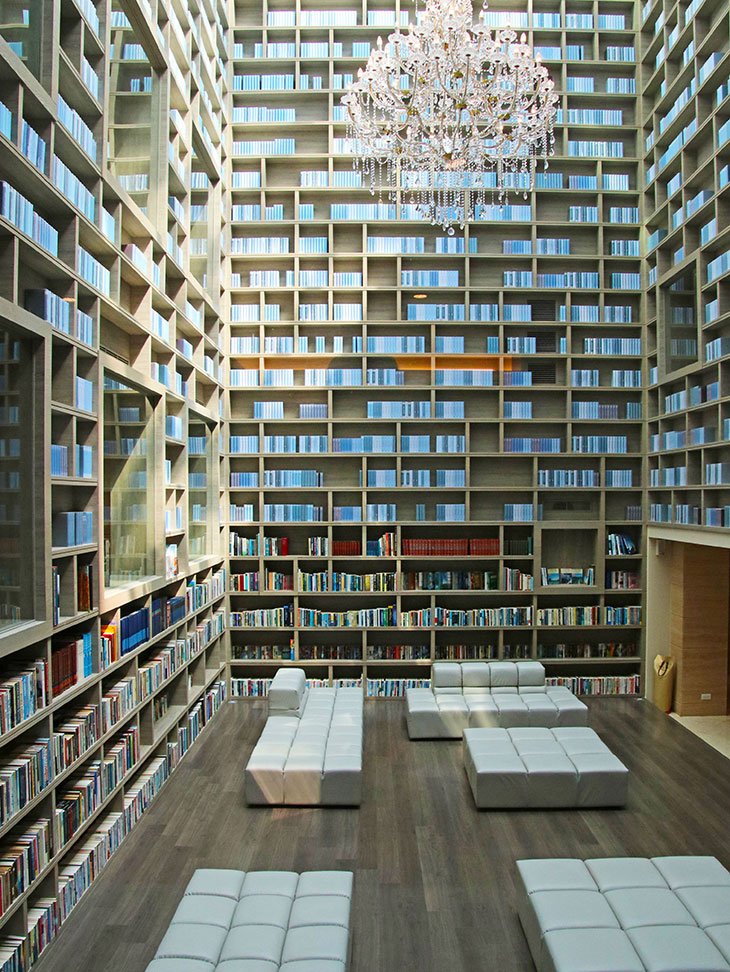 三面高達四個樓層的書牆,穿透天窗,一方天色;是一個光影幻化的小世界 —— 穿越光陰,讀見海明威,翻過挪威森林…。