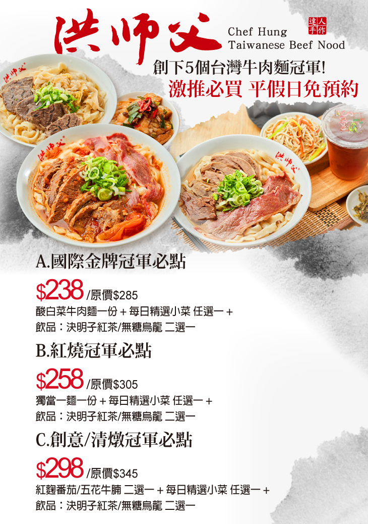 連續五度榮獲「台北國際牛肉麵節」冠軍,受到各界饕客一致肯定的美味,現在推出好康優惠,錯過這次,後悔一世!