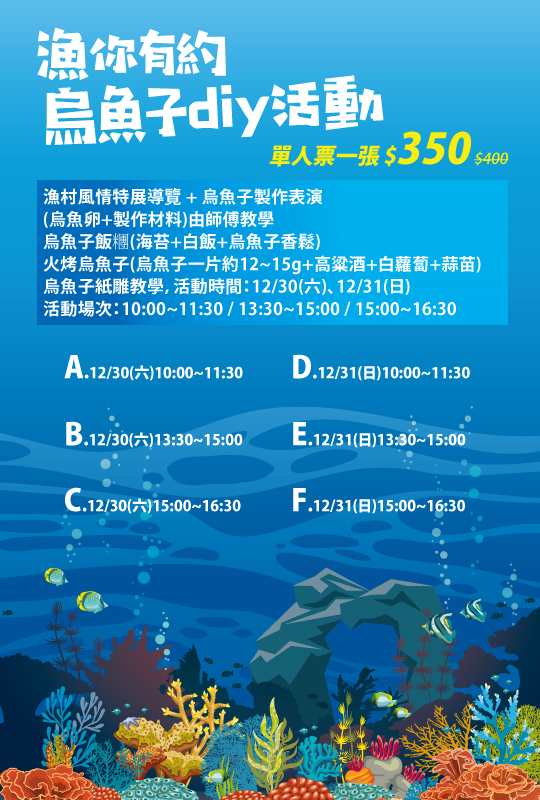 陽明高雄海洋探索館將於 2018 年隆重推出「年年有魚-台灣漁村風情特展」特於元旦連假期間,假海洋探索館內舉辦【漁你有約,烏魚子DIY】體驗活動。活動期間 106 年 12 月 30 ~ 31 日,計辦理 6 個場次。