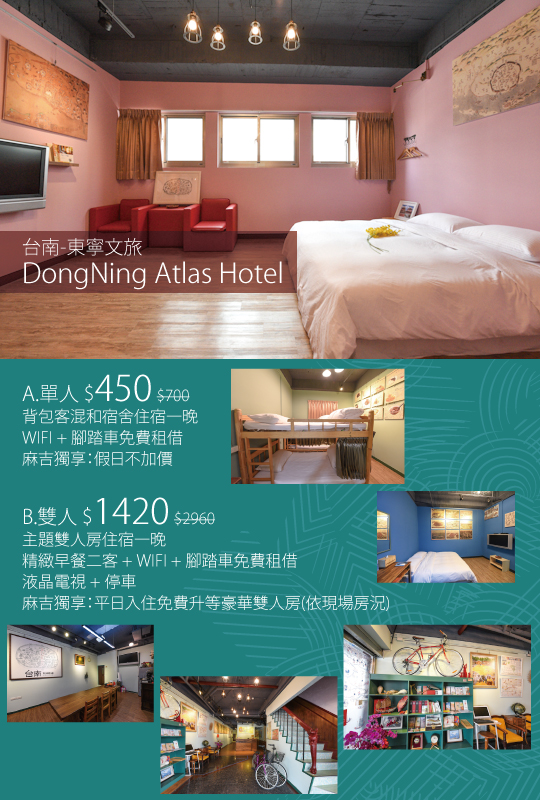 「東寧文旅」(DongNing Atlas Hotel- Explore the DNA of Tainan),位於台南市中心最繁華的地點,美食小吃及古蹟景點環繞,是年輕人帶著對52年老旅館改造再生的夢想,所完成的案例。全館是以「地圖」為主題的風格旅店,分為「台南與台灣」、「人與環境」及「世界與宇宙」等三個設計主軸,是麻吉在台南旅遊散步的最佳住宿選擇。