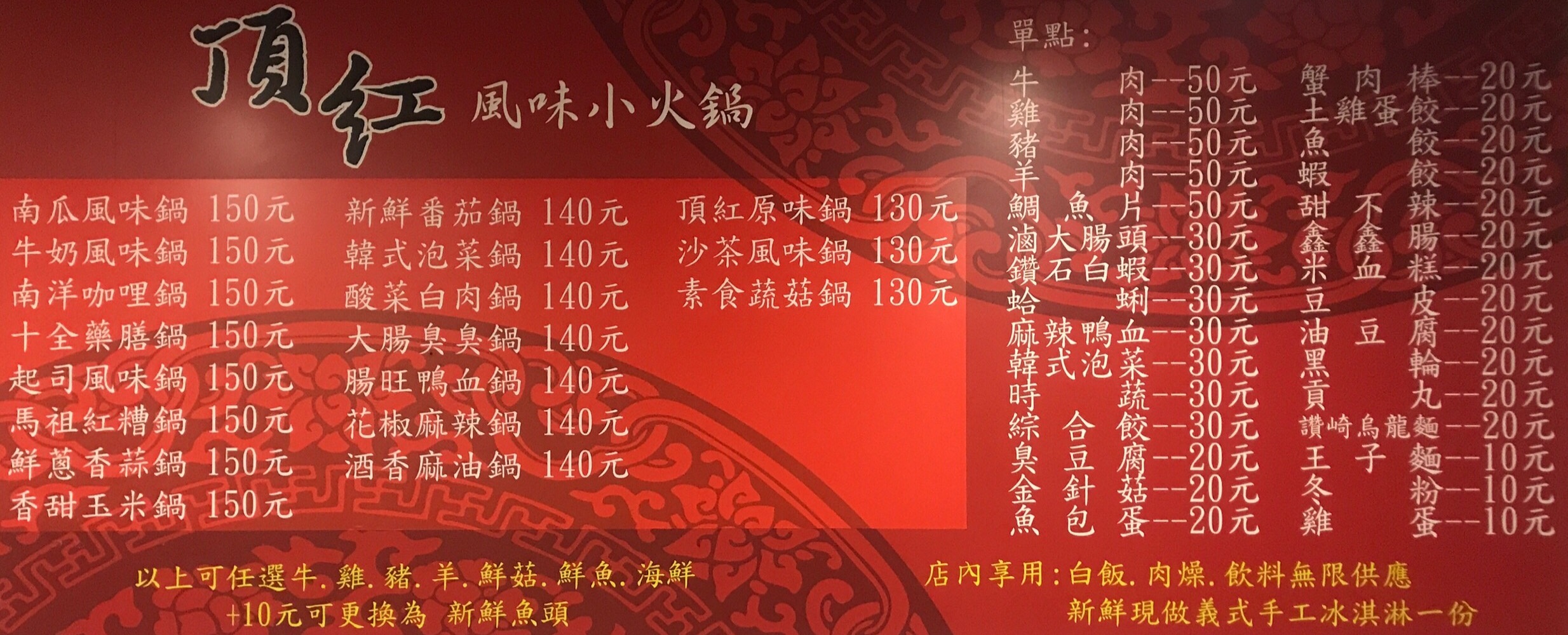 特別推薦:牛奶風味鍋、南洋咖哩鍋、起司風味鍋、韓式泡菜鍋、花椒麻辣鍋、酸菜白肉鍋、頂紅原味鍋