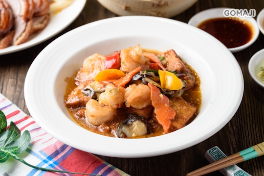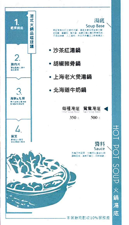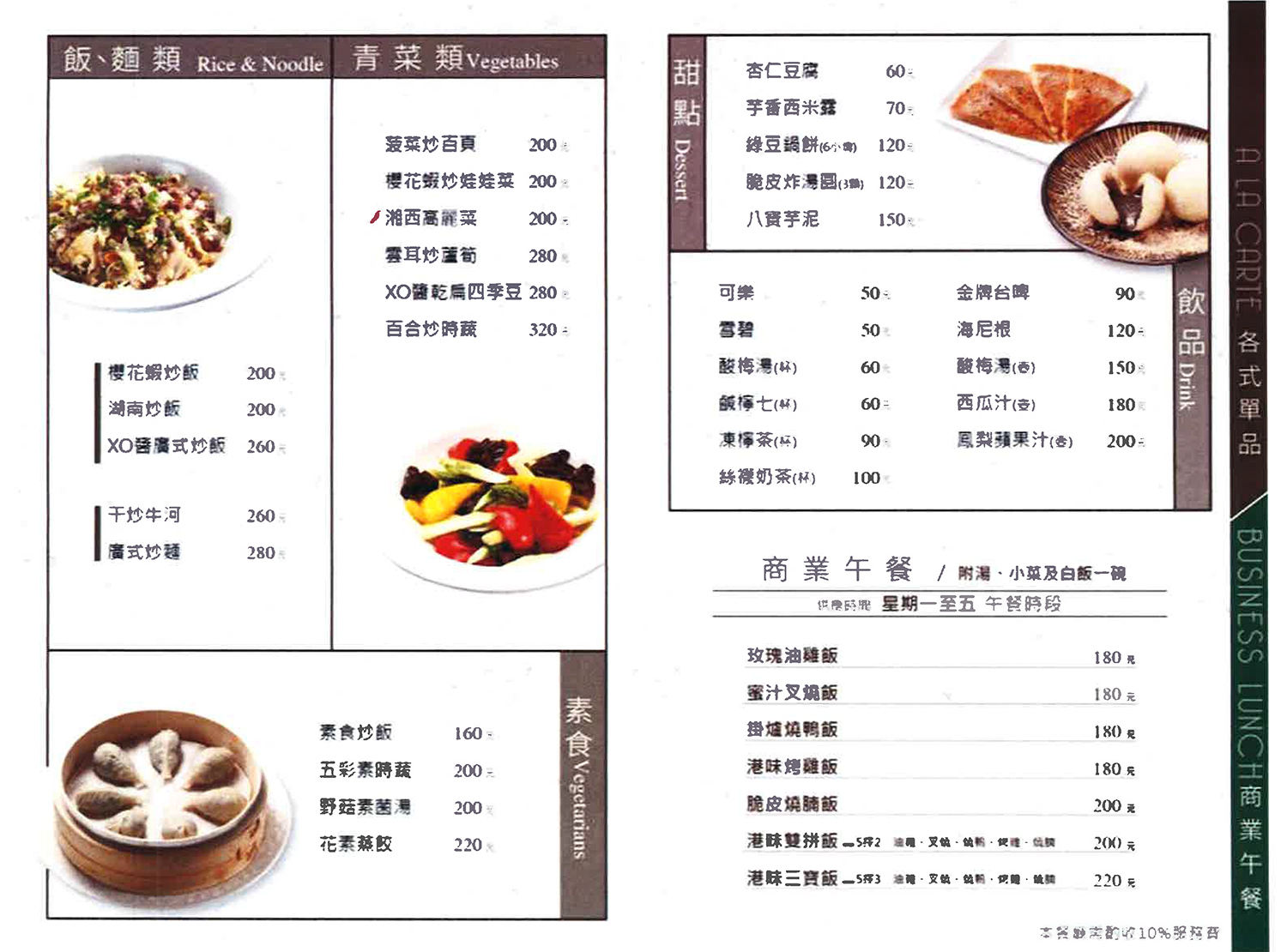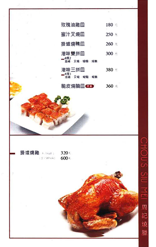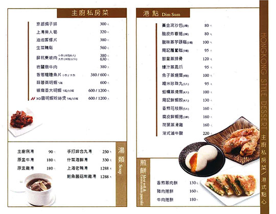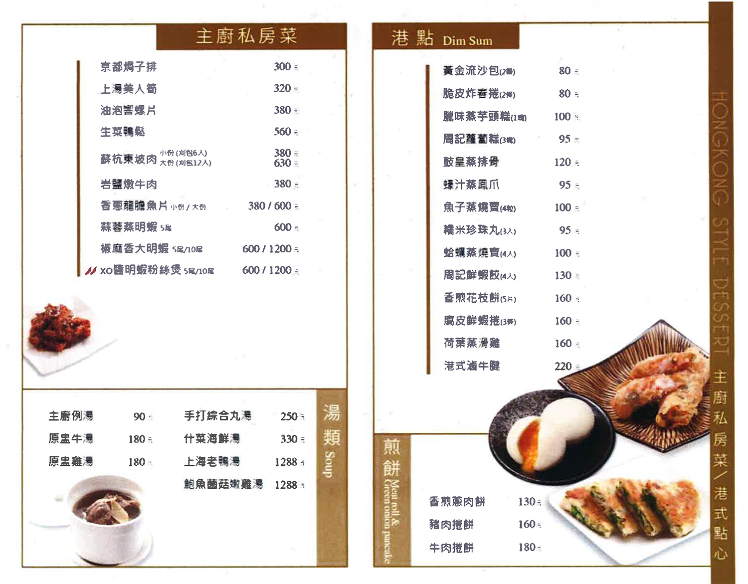 XO醬明蝦粉絲煲、蘇杭東坡肉、香煮龍膽魚片、京都焗子排、原盅雞湯、牛肉捲餅、糯米珍珠丸、周記蘿蔔糕、港式滷牛腱、臘味蒸芋頭糕、掛爐燒雞、玫瑰油雞皿、港式火鍋、廣式炒麵、甜點等