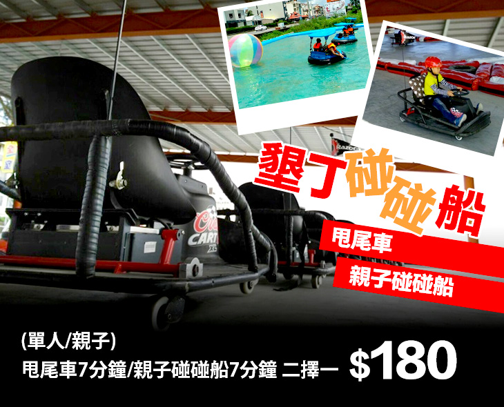墾丁碰碰船 超酷、超炫、超威的【墾丁碰碰船】帥氣登場囉!全新規劃的賽道,不僅賽道超長,更獨家設計有長短程雙賽道切換設計,隨時可以拉近選手間的距離,讓同伴彼此之間有如神出鬼沒一般,更增添奔馳的樂趣! 本次推出甩尾車及親子碰碰船之人氣強打活動,透過甩尾車、碰碰船增添彼此感情,考驗自我專注與耐力,美好的假期還沒開始規劃嗎?不妨透過這難得機會,購入一波,揪伴來體驗!為彼此創造美好回憶! 單人/親子甩尾車7分鐘 ➽ ➽ ➽ 親子碰碰船7分鐘 ➽ ➽ ➽