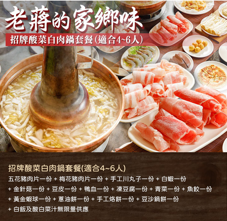 〈五花豬肉片一份 + 梅花豬肉片一份 + 手工川丸子一份 + 白蝦一份 + 金針菇一份 + 豆皮一份 + 鴨血一份 + 凍豆腐一份 + 青菜一份 + 魚餃一份 + 黃金蝦球一份 + 蔥油餅一份 + 手工烙餅一份 + 豆沙鍋餅一份 + 白飯及酸白菜汁無限量供應〉