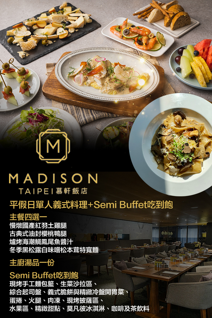 另外除了單人義式料理以外,還有Semi Buffet吃到飽多樣自助式料理任您選搭享用喔!約會、聚餐首選,趕緊手刀購入,前往大啖一波!