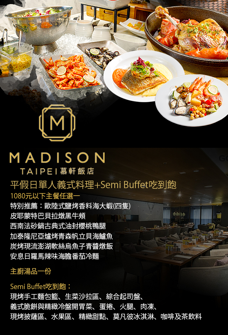 另外除了單人義式料理以外,還有Semi Buffet吃到飽多樣自助式料理任您選搭享用喔!約會、聚餐首選,趕緊手刀購入,前往大啖一波!