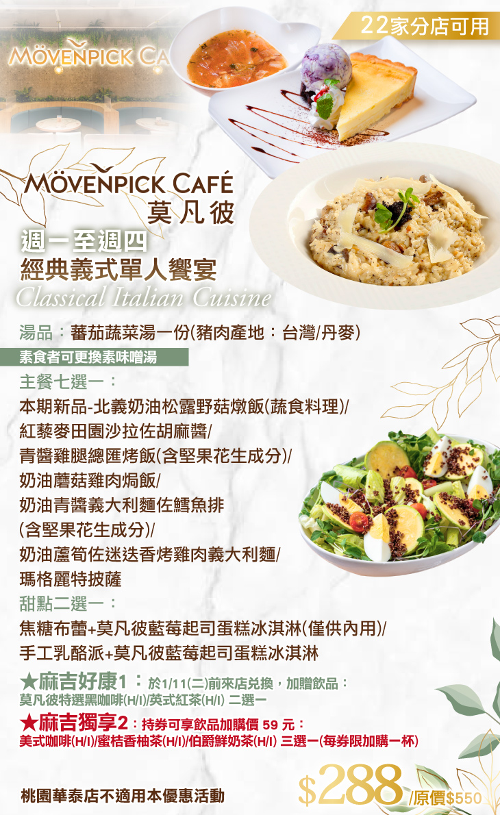 ★ 麻吉好康1:於2022/1/11(二)前來店兌換,加贈飲品:莫凡彼特選黑咖啡(H/I)/英式紅茶(H/I) 二選一