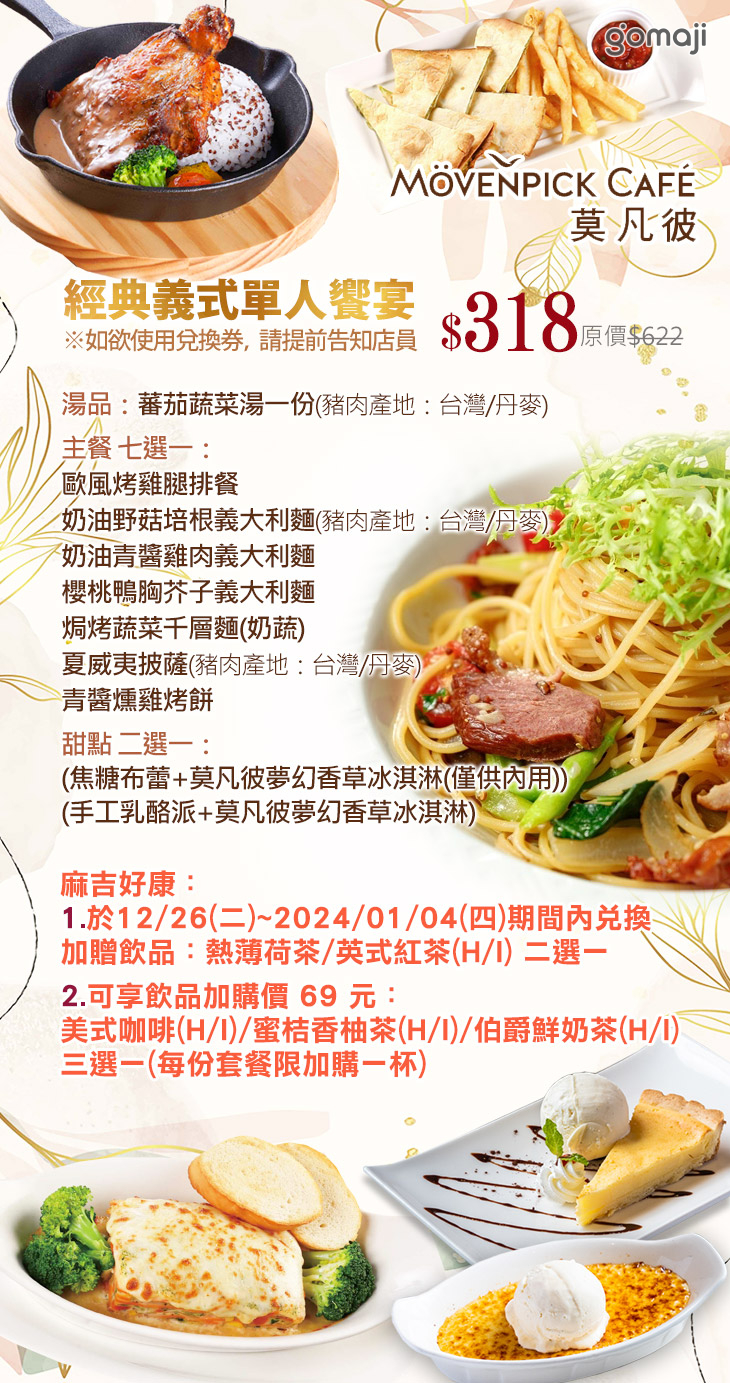 ★ 於12/26(二)~2024/01/04(四)期間內兌換加贈飲品:熱薄荷茶/英式紅茶(H/I) 二選一